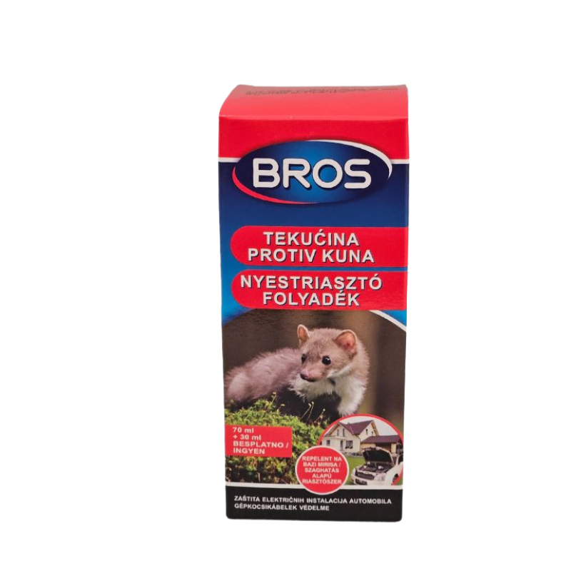 Bros Nyestriasztó folyadék 0,1 L – Szaghatás alapú nyest riasztó 0,5% gerániol hatóanyaggal. Bros nyestriasztó beltéri helyiségek, járművek, nyílt terek. Hígítás nélkül, 8 hétig hatásos.