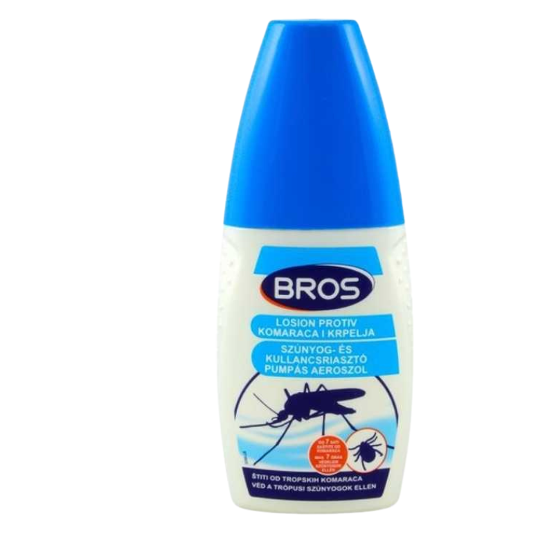 Bros Szúnyog-kullancs riasztó pumpás – DEET tartalmú riasztó spray szúnyogok, kullancok ellen. Bros szu-ku riasztó 7 óra szúnyog, 4 óra kullancs, 5 óra tigrisszúnyog védelem. Bőrre, ruhára alkalmazható.