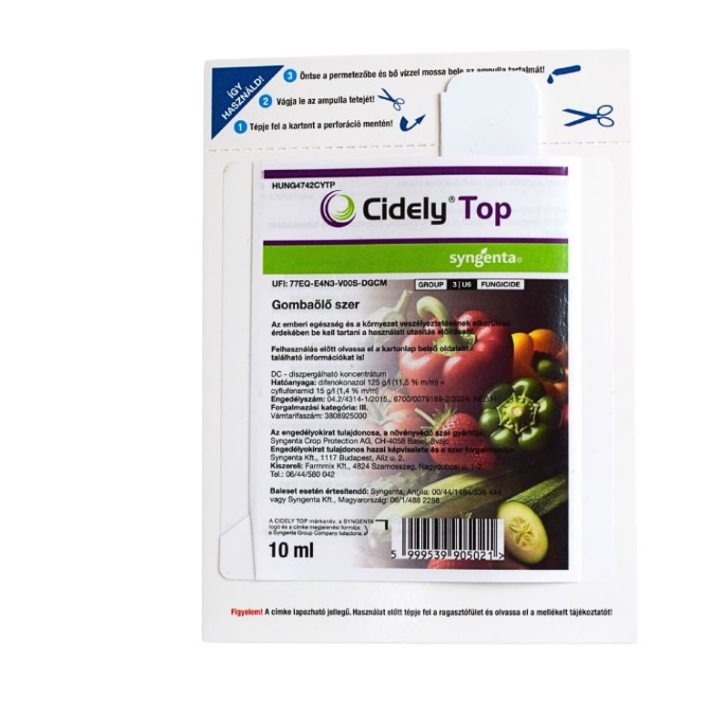 Cidely Top 10 ml ampulla – Gombaölő szer difenokonazol 125 g/l, ciflufenamid 15 g/l. Paradicsom, paprika, szamóca, uborka, cukkini, görög- és sárgadinnye gombabetegségei ellen. 3 nap ÉVI, szabadföldi és hajtatott.