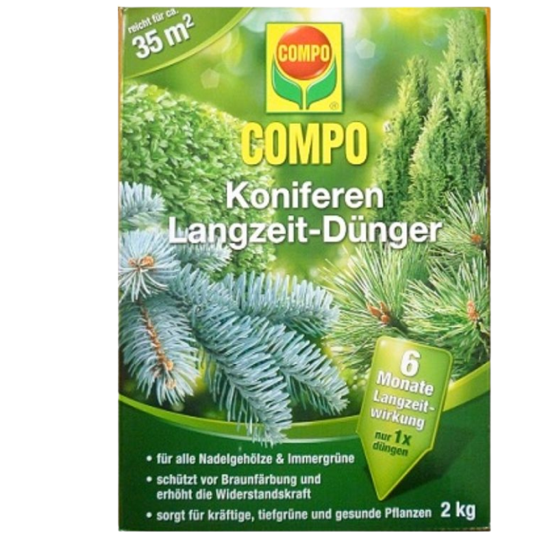 Compo trágya Fenyő hosszúhatású 2/1 – Speciális magnéziumos tűlevelű műtrágya NPK 15-9-14 összetétellel. Compo fenyő trágya 6 hónapos hosszúhatású, élénkzöld levelekért, barnulás ellen. Mikroelemekkel. Február-október.