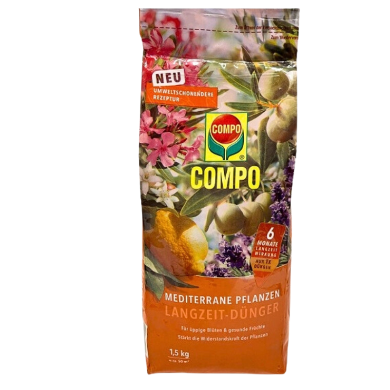 Compo trágya Mediterrán hosszúhatású 1,5 kg – Speciális mediterrán növény trágya NPK 14-7-15 (+2) összetétellel. Compo mediterrán trágya olajfa, leander, levendula, hibiszkusz, füge. 6 hónap hatástartam, szezonban egyszer. Március-október.