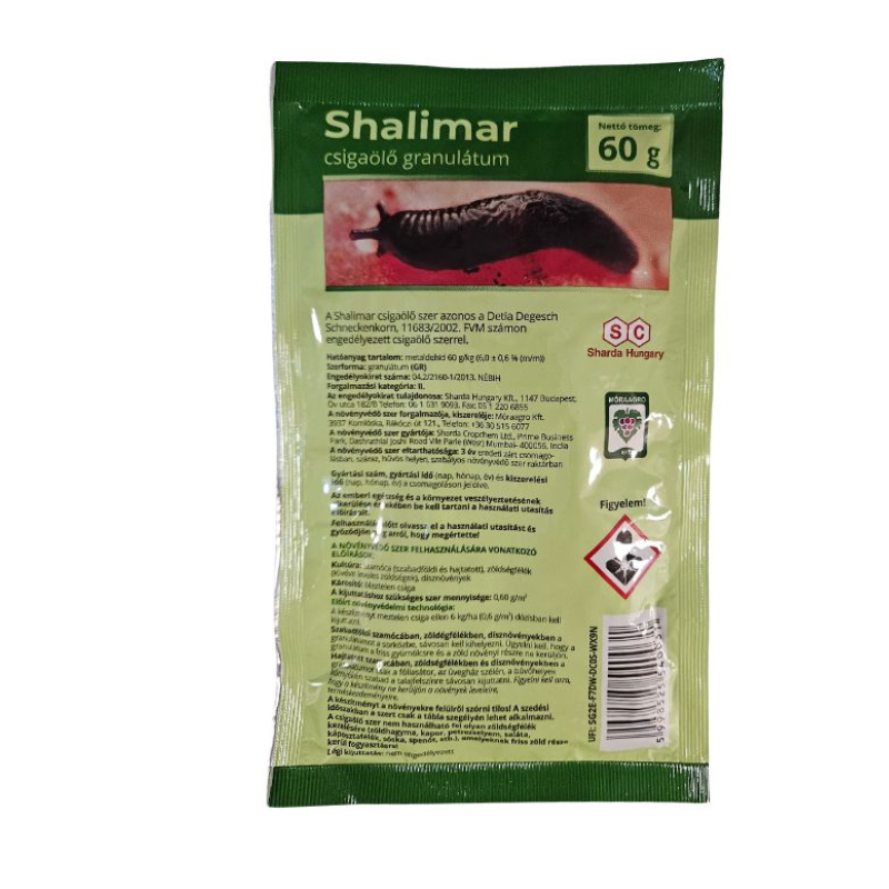 Shalimar csigaölő granulátum – Gyors hatású csigairtó 6% metaldehid hatóanyaggal. Meztelencsigák ellen szamóca, zöldség, dísznövény kultúrákban. 0,6 g/m² adagolás. 60g, 600g kiszerelés.