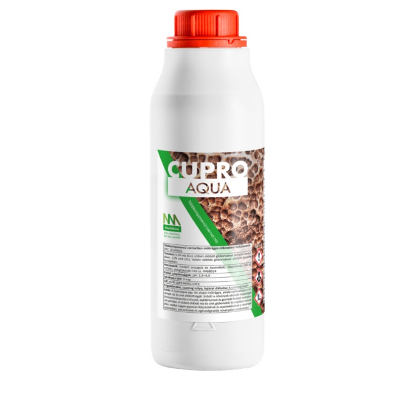 CuproAqua lombtrágya 5,3% réz, 1% cink – Biotermesztésben használható, glükonsav komplex formájú réz-cink lombtrágya. Hiánybetegségek és fertőzések ellen. 20-70 ml/10L víz. Növeli a növények ellenálló képességét gomba, baktérium és vírusos megbetegedésekkel szemben.