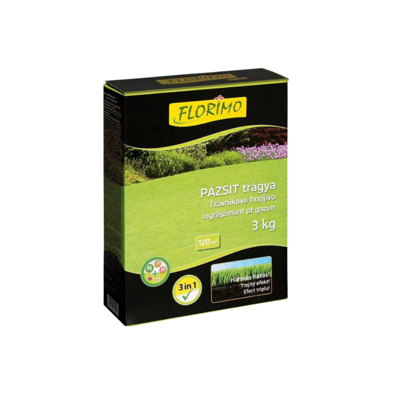 A florimo pázsit trágya 3 in 1 egy speciális, professzionális gyeptrágya, amely három hatást egyesít: gyors növekedés, intenzív zöld szín és mohásodás elleni védelem. Ha egészséges, sűrű pázsitot szeretnél, a florimo pázsit trágya a legjobb választás!
