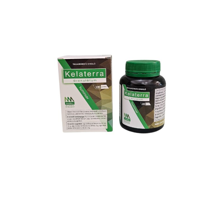 Kelaterra Granulált 🌱 Speciális ásványi anyagból (leonardit) kivont vízoldható huminsav, granulált formában. Hatóanyag: huminsavak és fulvosavak. Adagolás: 20-50 kg/ha. Alkalmazás: valamennyi kultúrában, talajban vagy lombtrágyaként, permetszerekkel keverve. Hatás: hasznos anyagok mobilizálása és növénybe jutása talajból, nehézfémek megkötése és semlegesítése, katalizátor – elektrolit rendszer stabilizálása, keringés javítása, hiánybetegségek megelőzése és kezelése. Használat: indításkor, ültetéskor, hiánytünetek esetén. Bármivel keverhetõ!