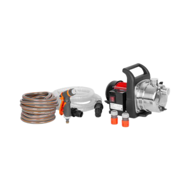 A kerti szivattyú komplett készlettel érkezik. 1000W teljesítmény, 57 l/perc kapacitás, INOX kivitel – ideális öntözéshez, medence feltöltéshez és vízmentesítéshez.