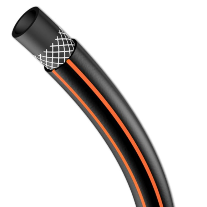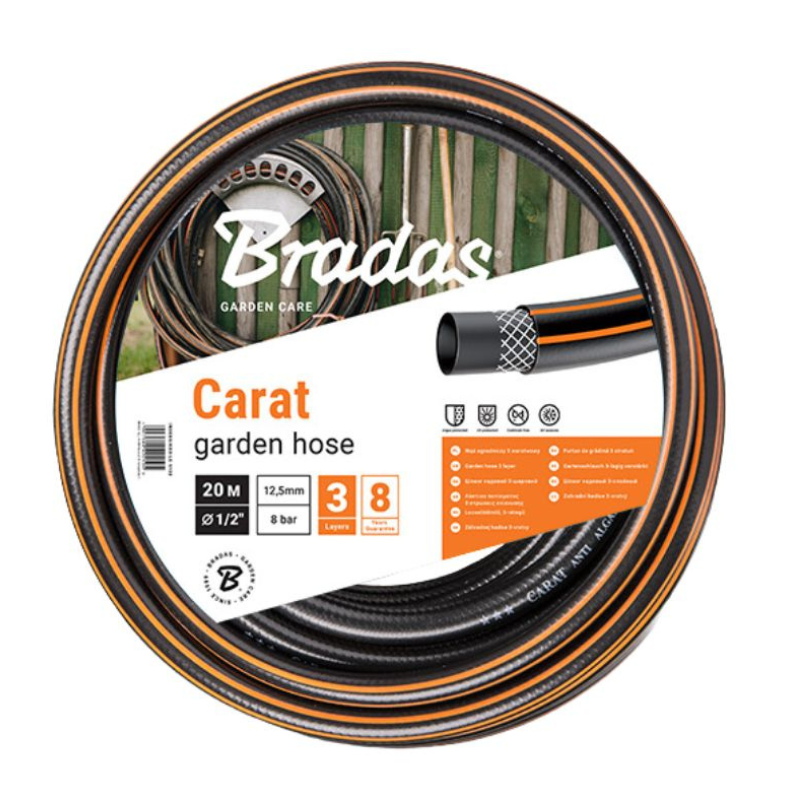 Locsoló Tömlő Carat Fekete 1/2″ 20m 💧 A prémium választás igényes kertészeknek! 3 rétegű, megnövelt tömegű, erősített PVC – extra tartós, jobban ellenáll a csavarodásnak és mechanikai sérüléseknek! 🌱 8 bar nyomásig használható – erős víznyomás, hatékony öntözés! ⚡ Minden évszakban használható – télen-nyáron megbízható! 💚 Kadmium mentes – környezetbarát, biztonságos! I réteg: fekete PVC belső réteg, UV álló és algásodás gátló – tiszta víz, hosszú élettartam! II réteg: hálós fonat szintetikus szálakból – erősített, szakadásbiztos! III réteg: fekete PVC külső réteg két narancsszín csíkkal – elegáns, jól látható! 🏡 1/2″ (12,5mm) átmérő, 20m hossz – tökéletes kis-közepes kertekhez! Korlátlan eltarthatóság – évekig használható!