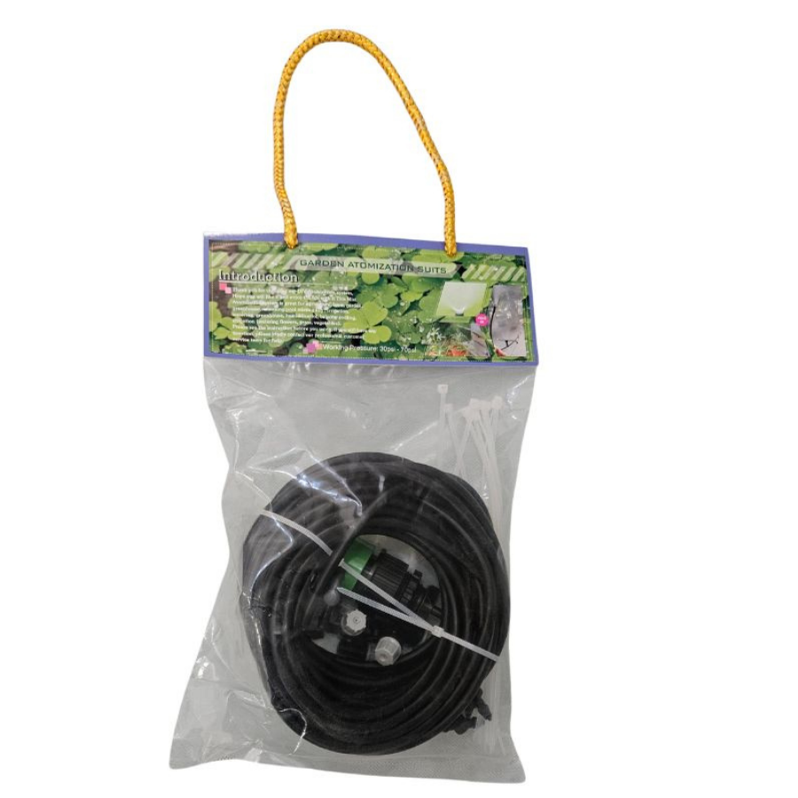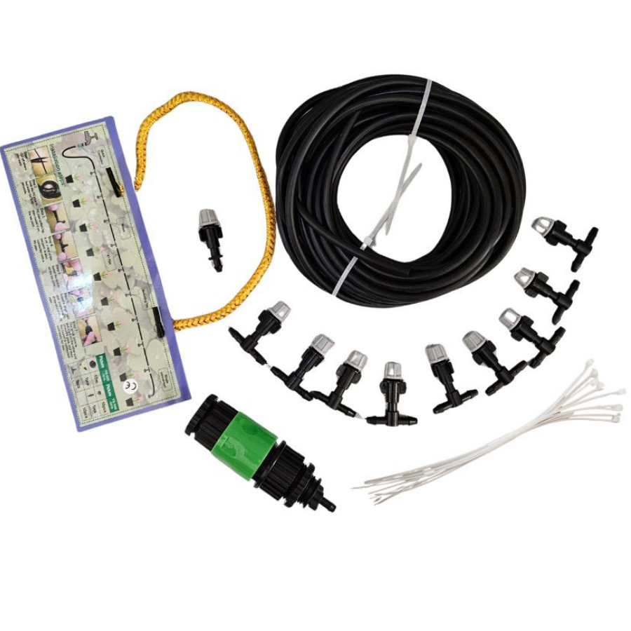 A rendszer teljes hossza 10 méter, ami ideális egy kisebb terasz, egy ágyás-sor vagy egy üvegház-szakasz öntözésére és hűtésére. Ha nagyobb területet szeretnél lefedni, több szettet is kombinálhatsz.