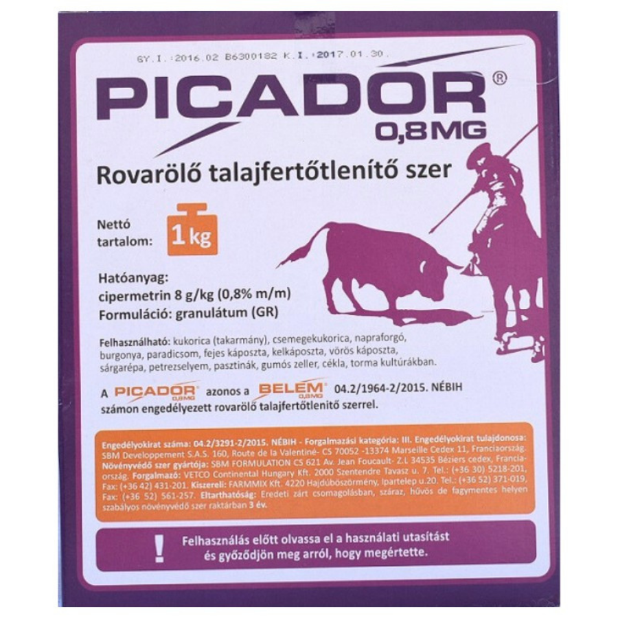 Picador MG 1/1 🐛 Rovarölő talajfertőtlenítő granulátum (GR), amely azonos a jól ismert Belem 0,8 MG termékkel. Hatóanyaga 8 g/kg cipermetrin. Kukoricában, napraforgóban, burgonyában, cukorrépában, paradicsomban, káposztafélékben (fejeskáposzta, kelkáposzta, vörös káposzta) és gyökérzöldségekben (sárgarépa, petrezselyem, pasztinák, gumós zeller, cékla, torma) használható rovarölő talajfertőtlenítésre.
