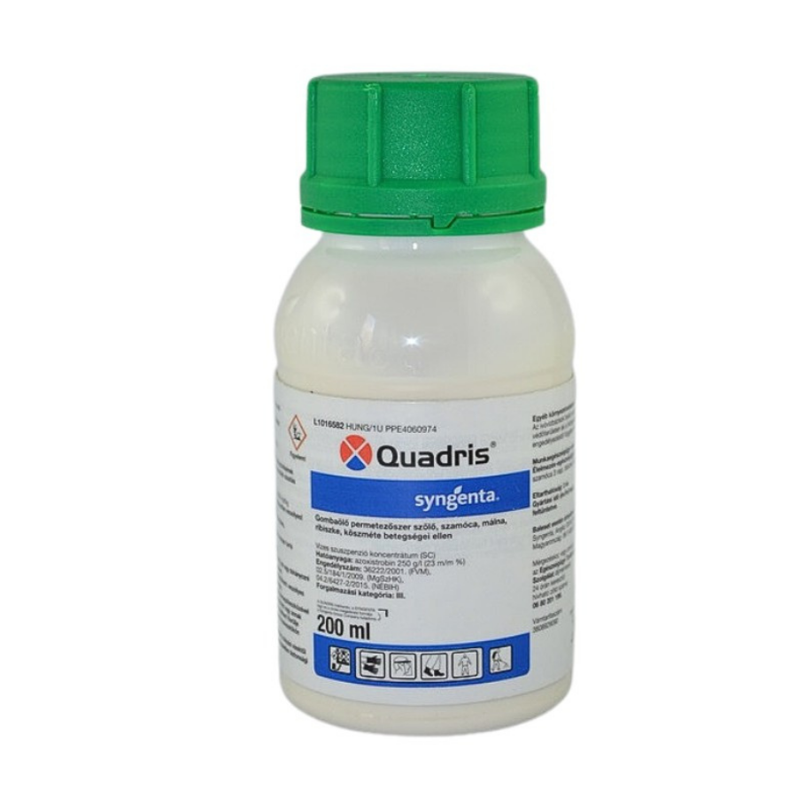 Quadris 0,2 SC gombaölő III. forgalmazási kategóriájú növényvédő szer, ezért a webshop szabályai szerint CSAK ÜZLETBEN KAPHATÓ – ÜRÖM. Online nem rendelhető, nem szállítható. Használat előtt mindig olvasd el az engedélyokiratot és a címkét!
